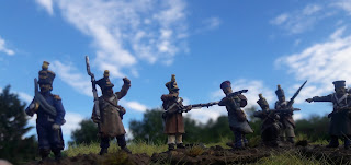 At the same time, I thought I'd put together a company at 1:1 in 28mm and used Calpe, Perry and few bits of Victrix. I decided to do all of these men with muskets but I now realise that, although accounts differ, at least half the men of this battalion were armed with rifles - so I'll need to go back and add a similar number of rifle-armed figs and spread them out across the 6 companies present.