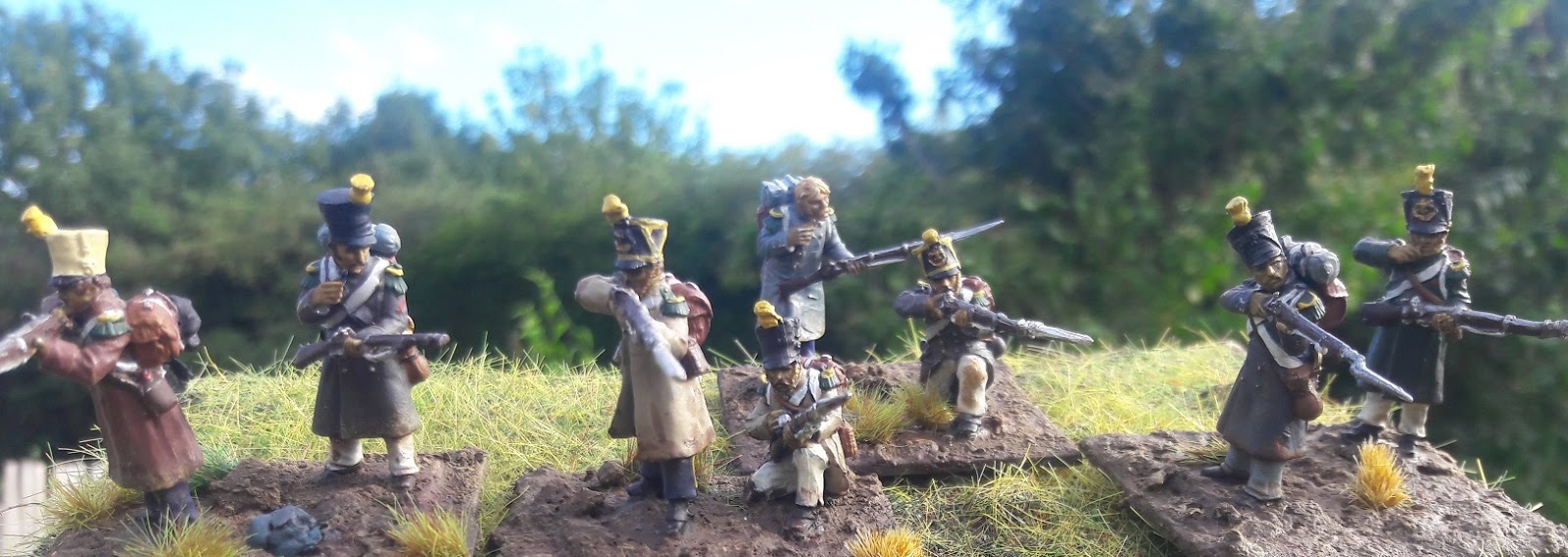 At the same time, I thought I'd put together a company at 1:1 in 28mm and used Calpe, Perry and few bits of Victrix. I decided to do all of these men with muskets but I now realise that, although accounts differ, at least half the men of this battalion were armed with rifles - so I'll need to go back and add a similar number of rifle-armed figs and spread them out across the 6 companies present.